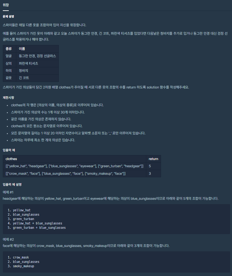 이 문제는 같은 종류의 물건들을 제외한 조합 경우의수를 생각해보면 되는데 우선 같은 종류의 옷을 딕셔너리에 정리한 후