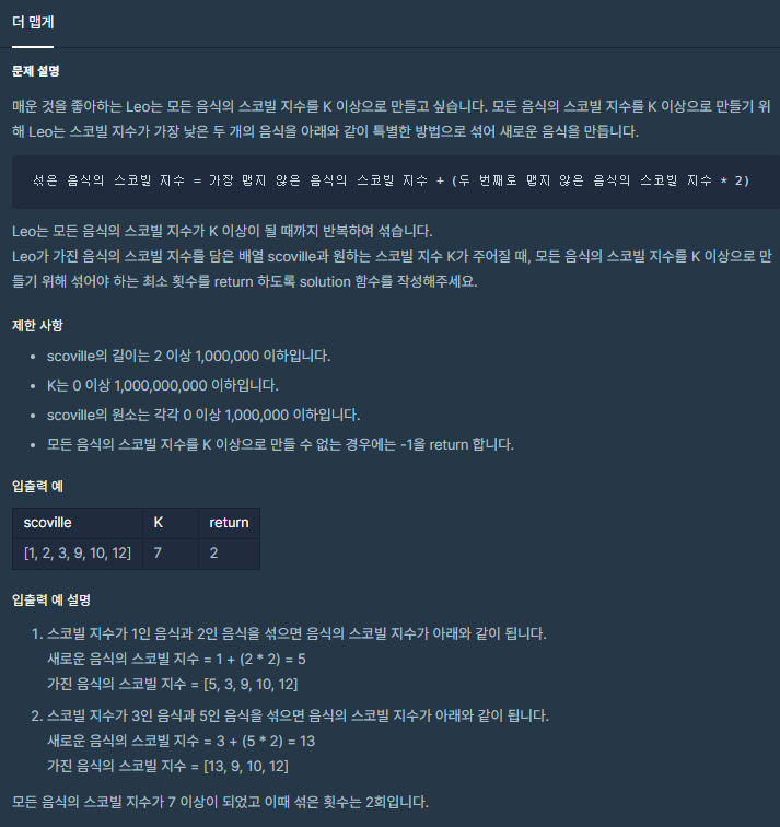 | [LV2] 더 맵게 문제링크 매운 것을 좋아하는 Leo는 모든 음식의 스코빌 지수를 K 이상으로 만들고 싶습니다. 모든 음식의 스코빌 지수를 K 이상으로 만들기 위해 Leo는 스코빌 지수가 가장 낮은 두 개의 www.programmers.co.kr |