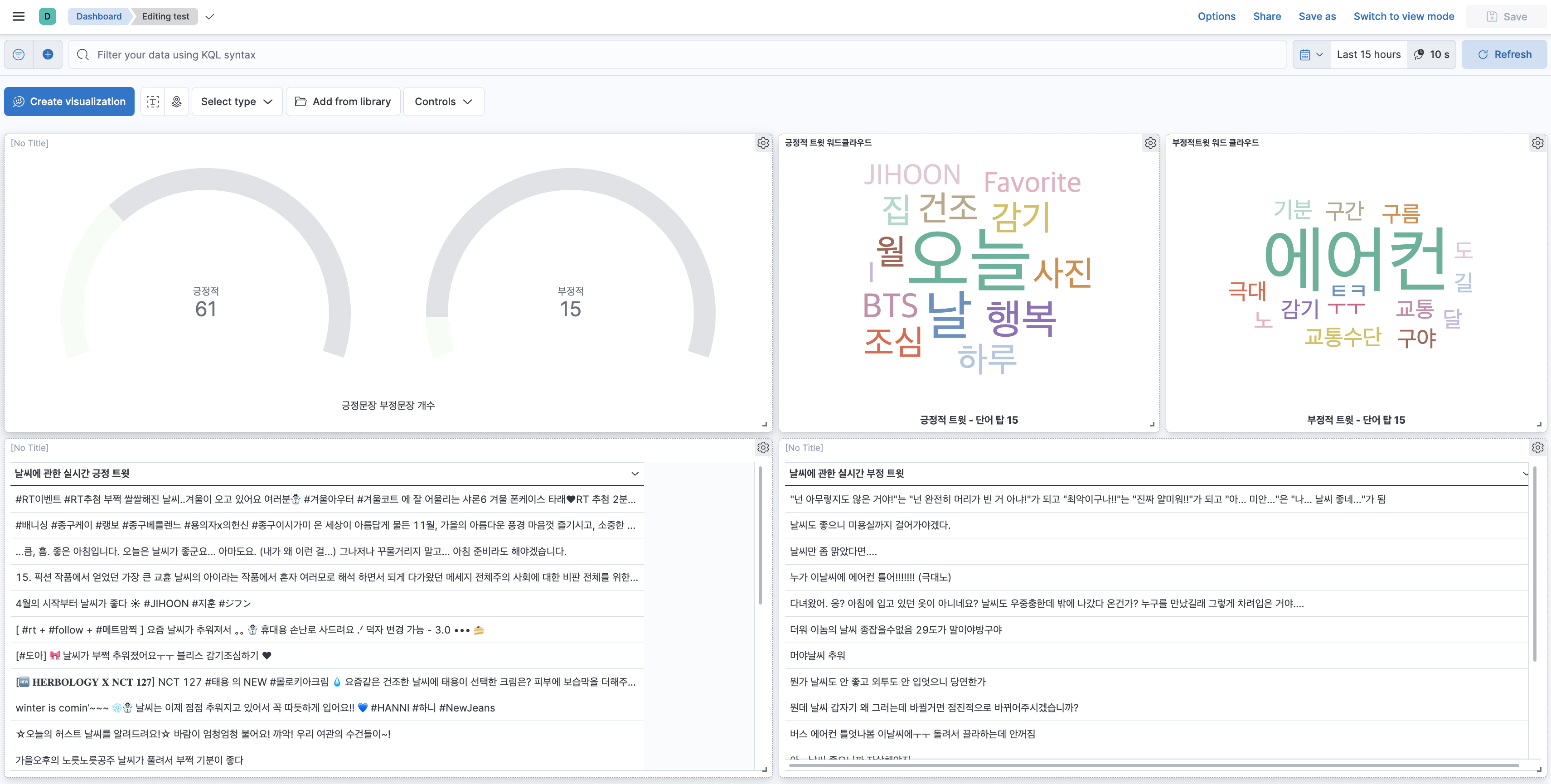 구성에 대해서 간단하게 설명해보면 앞서 긍정, 부정을 예측해서 나타낸 필드인 setiment-predict의 긍정적, 부정적 개수를 따로 집계하여 서로 비교할 수 있도록 하였다. 여기서도 똑같이 정확도가 떨어지는 텍스트는 제외하기 위해서 0.8-1 사이의 정확도를 가진 텍스트만 집계하였다
