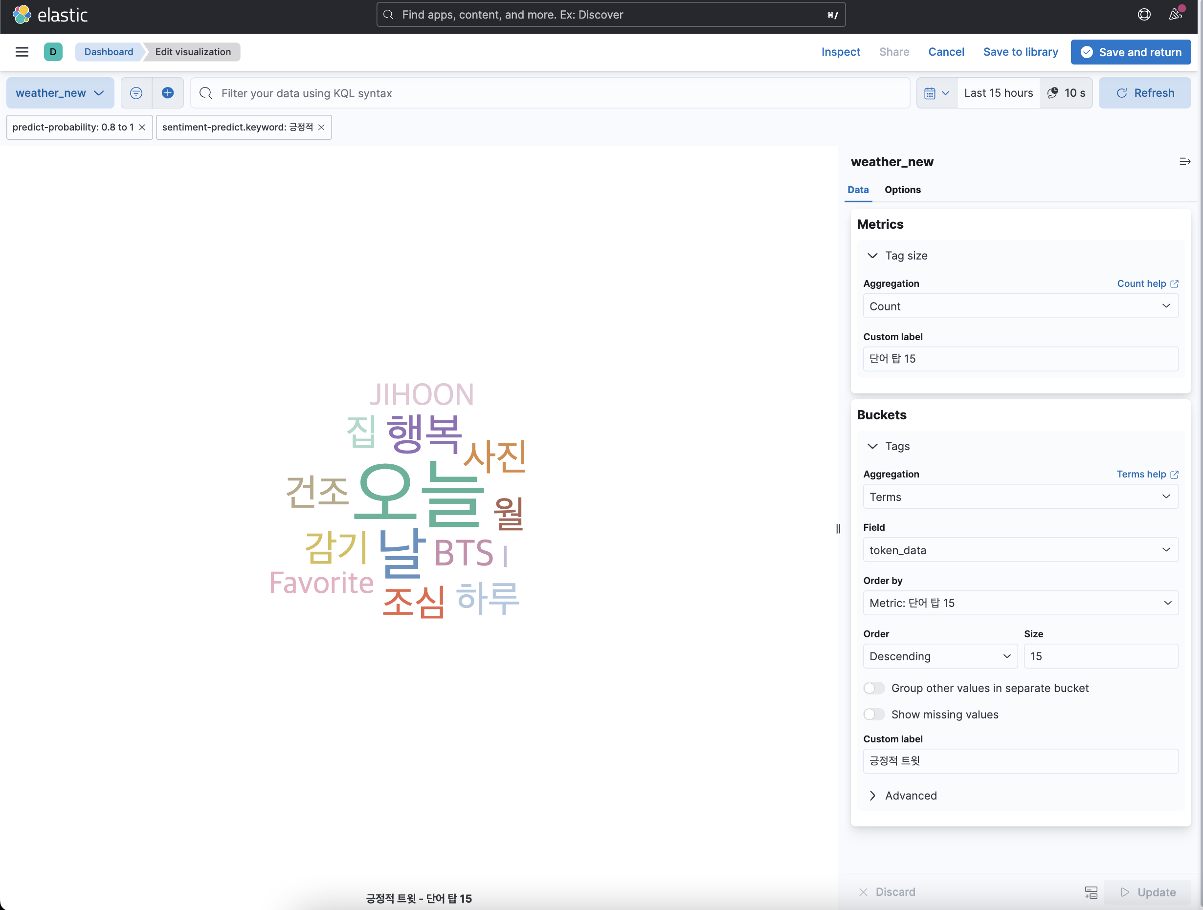 여기서 보면은 앞서 시각화한 것과 동일하게 정확도를 0.8~1로 설정해주었고 긍정적 트윗 워드 클라우드만을 시각화하기 위해서 필터를 긍정적으로 정했으며 많이 언급된 단어를 탑 15까지 워드 클라우드로 표현해주게 설정하였다. 부정적 워드 클라우드도 예측 필터가 부정적인 것을 제외하고는 동일하게 설정하였다.