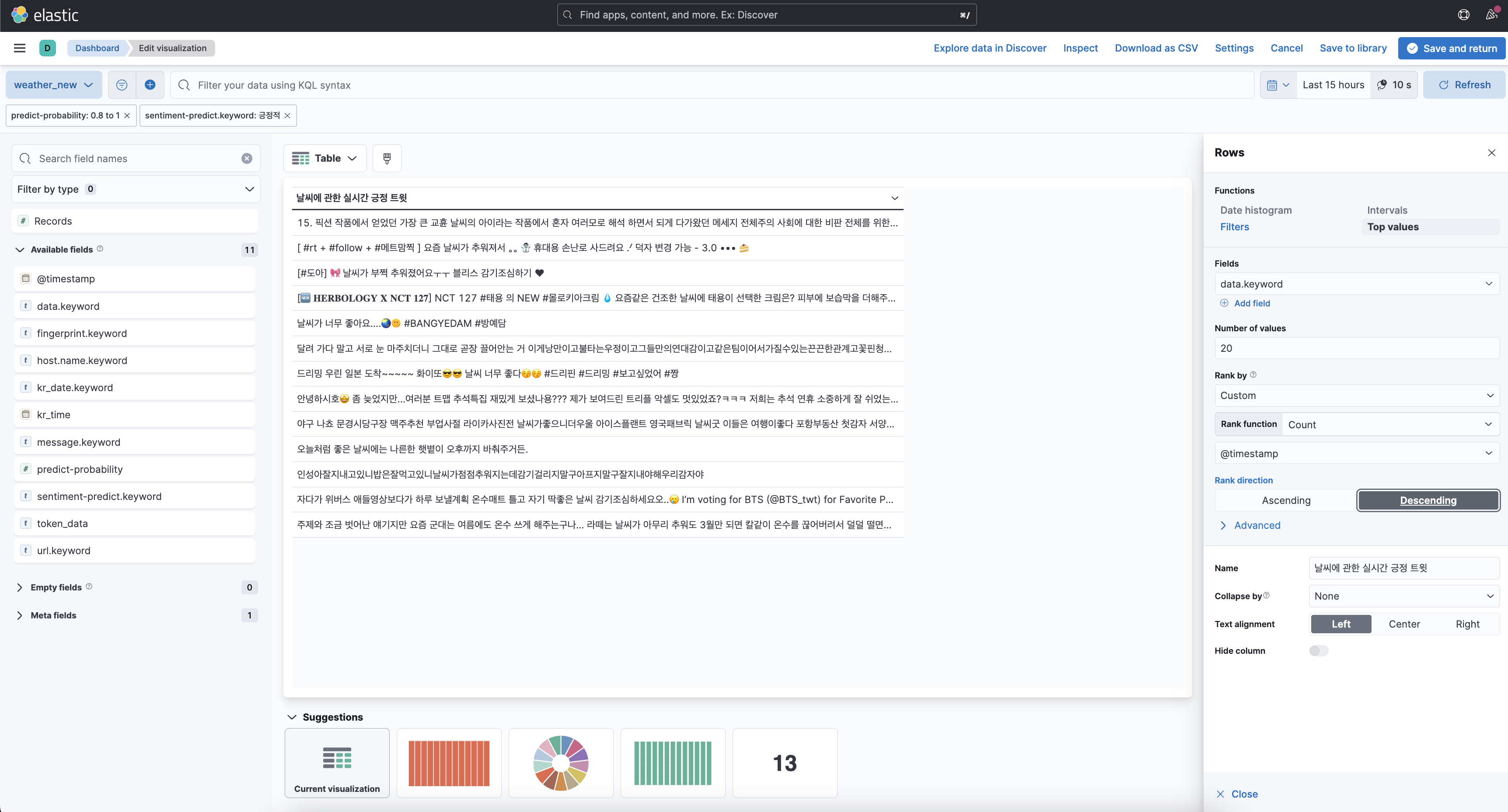 우선 긍정적인 문장과 부정적인 문장을 보여주기 위해서 data table 시각화를 사용하였고 필터는 앞서 Ingest pipeline에서 긍정, 부정으로 나눈 결과를 사용하였다. 여기서 시각화 조건을 보면 predict-probability가 0.8에서 1로 설정해주었고 감정분석 결과가 긍정적인 것만 시각화 되게 설정했다. 여기서 처음에 예측 정확도가 너무 떨어지는 것들은 추가하지 않기 위해서 이렇게 설정했다. 이 설정을 하려면 predict-probability가 소수여야 하는데 기존 pipeline을 실행시키면 text타입으로 저장되었기에 ingest pipeline에 convert 부분을 추가시켜 형 변환을 시켜준 후 시각화하였다.
