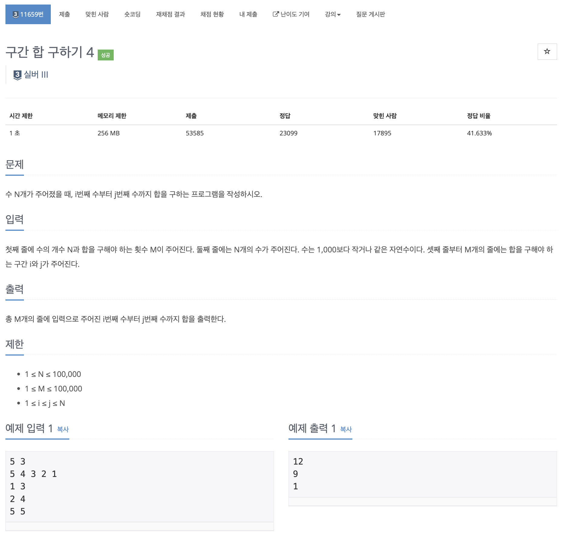 | # 백준 11659번 문제검색 링크 수 N개가 주어졌을 때, i번째 수부터 j번째 수까지 합을 구하는 프로그램을 작성하시오. www.acmicpc.net |