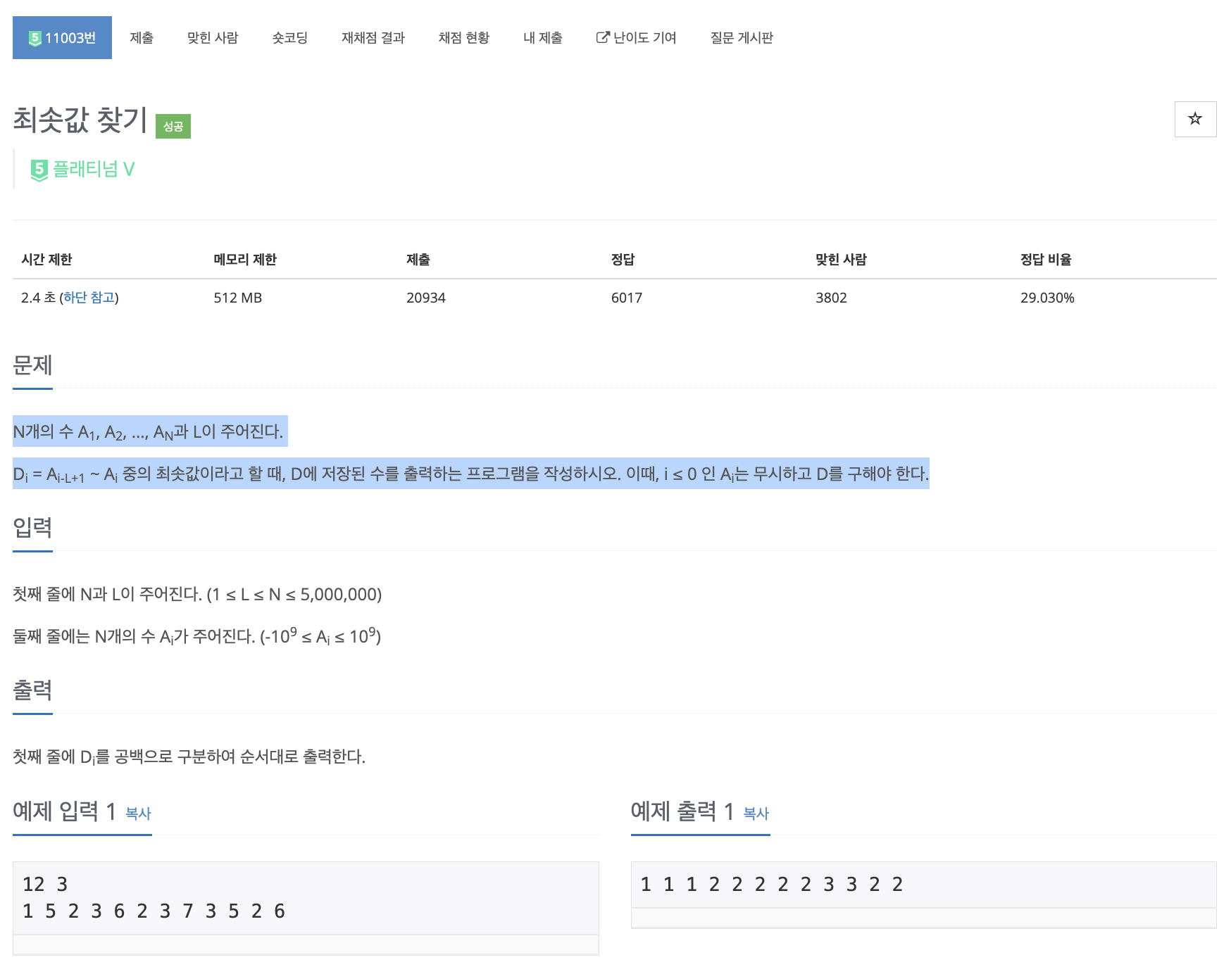 | # 백준 11003번 링크 N개의 수 A1, A2, ..., AN과 L이 주어진다.Di = Ai-L+1 ~ Ai 중의 최솟값이라고 할 때, D에 저장된 수를 출력하는 프로그램을 작성하시오. 이때, i ≤ 0 인 Ai는 무시하고 D를 구해야 한다. www.acmicpc.net |